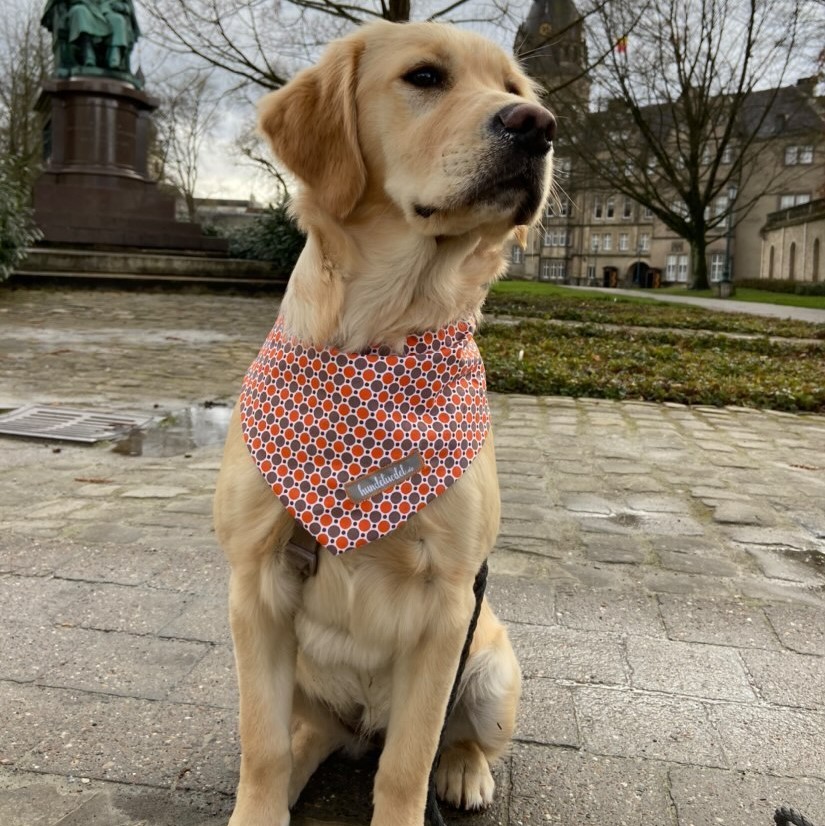 Viele Hunde sind als Therapiehunde unterwegs, vielleicht auch deiner? Dann kannst du hier euer Tuch so gestalten, wie ihr es für den Job benötigt. Auch Rot/Grün mit „Aktiv“ und „Pause“ kann genau das sein, was ihr braucht. So entstehen Botschaften, die deinen Hund auszeichnen.